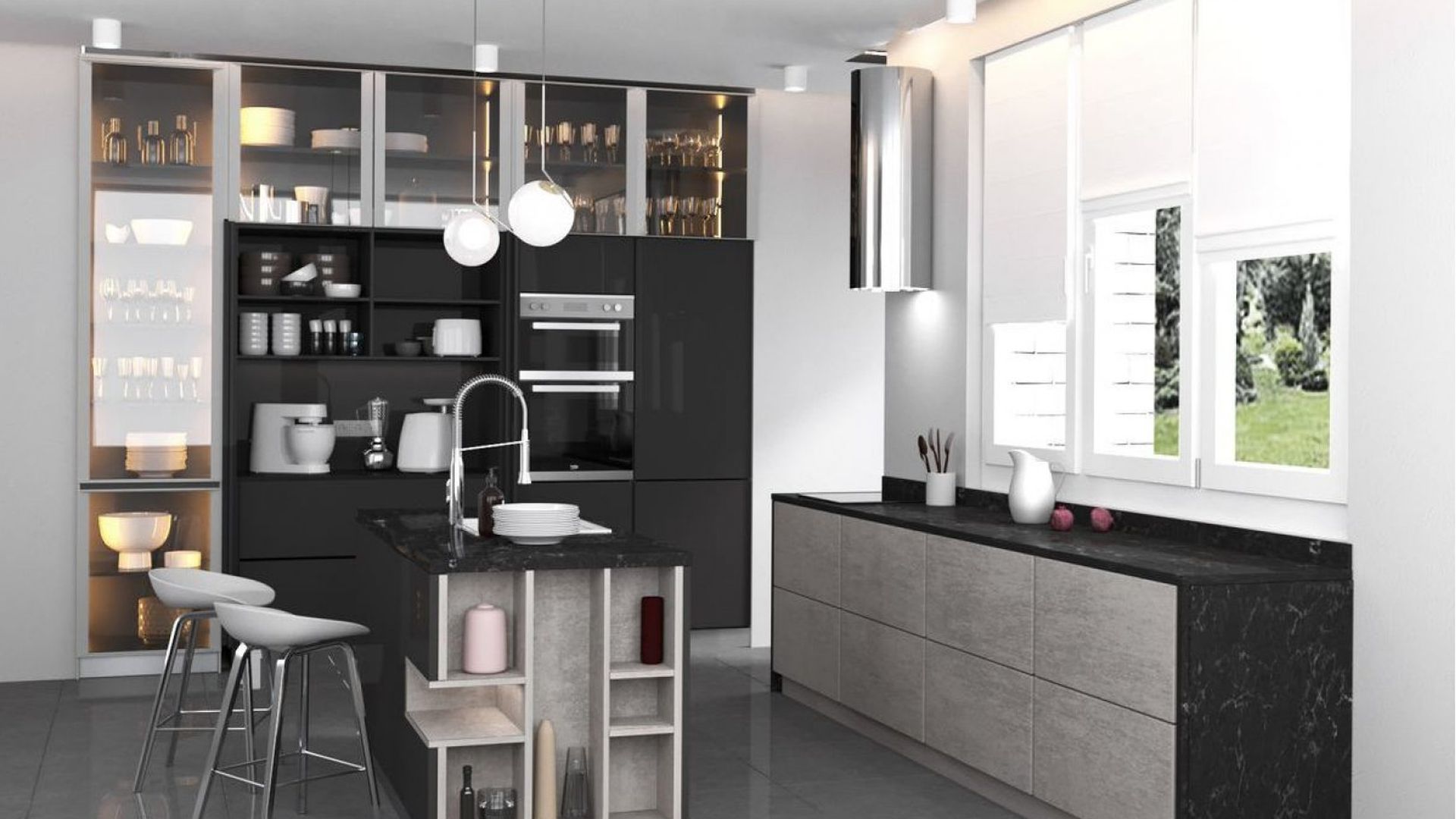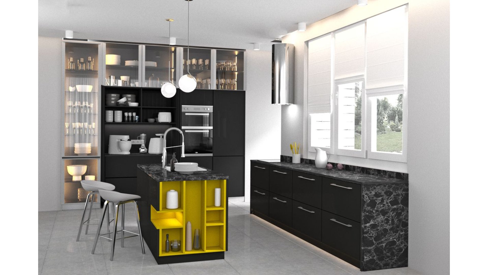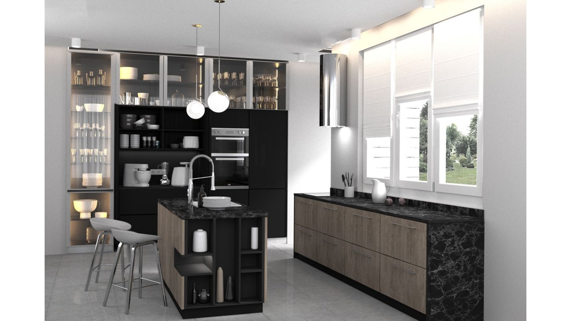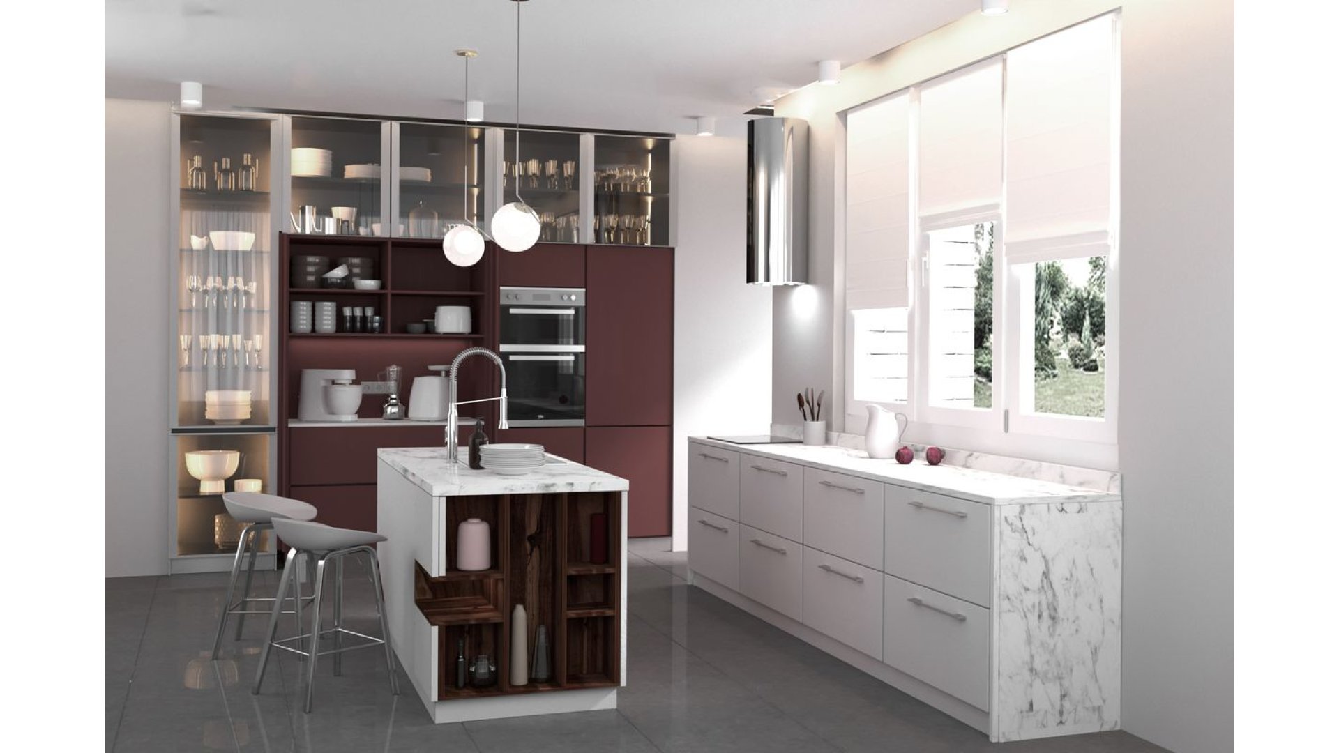 Дизайнерское решение кухни Iksora направлено на гармоничное сочетание смелых цветовых и фактурных акцентов с общей элегантной и минималистичной концепцией. Основные фасады и корпус кухни предлагается выполнить из австрийского ДСП EGGER или крашенного МДФ. Предполагается, также, добавить различные декоры EGGER с иммитацией древесных и мраморных фактур в корпус или фасады в отдельных секциях. Столешница также предложена из каталога декоров EGGER с иммитациями мрамора. В проектирование данной кухни закладывается высококачественная австрийская фурнитура BLUM. Особенностью данной кухни являются секции прозрачных витрин, выполненых из каленого стекла графит. Предлагается, также, оснастить кухню LED-подсветкой в открытых секциях и над рабочей поверхностью, что позволит сделать эксплуатацию кухни максимально комфортной и подчеркнуть особенности цветового решения.